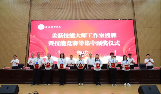 党委书记许克亮为河北省第一届技能大赛荣获金牌的教师孟磊颁奖,同时为“孟磊技师大师工作室”授牌。