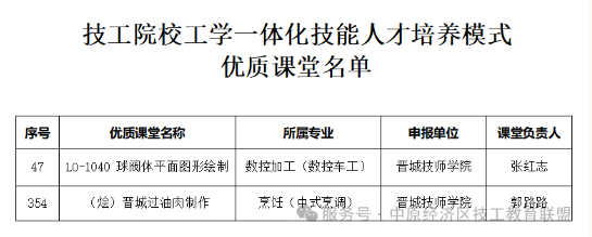 近日,人力资源社会保障部办公厅正式公布技工院校工学一体化技能人才培养模式优质课堂名单。学院“(烩)晋城过油肉的制作”、“LO-1040球阀体平面图形绘制”两个课堂凭借认真严谨的校标转换、科学合理的教学活动策划、创新务实的教学实施、成效显著的学习成果,成功入选名单!
