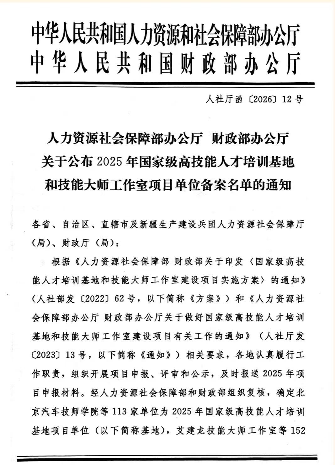 近日,人力资源社会保障部办公厅、财政部办公厅联合发布《关于公布2025年国家级高技能人才培训基地和技能大师工作室项目单位备案名单的通知》(人社厅函〔2026〕12号),石家庄技师学院成功入选2025年国家级高技能人才培训基地项目单位,这是学院第三次获批该国家级资质,标志着学院在高技能人才培养领域的办学实力与示范引领作用再次获得国家层面的高度认可。